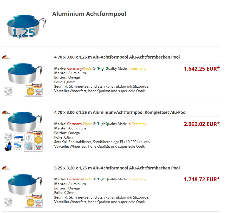 Aluminium-Achtformpools werden häufig als Komplettsets angeboten. Diese beinhalten: