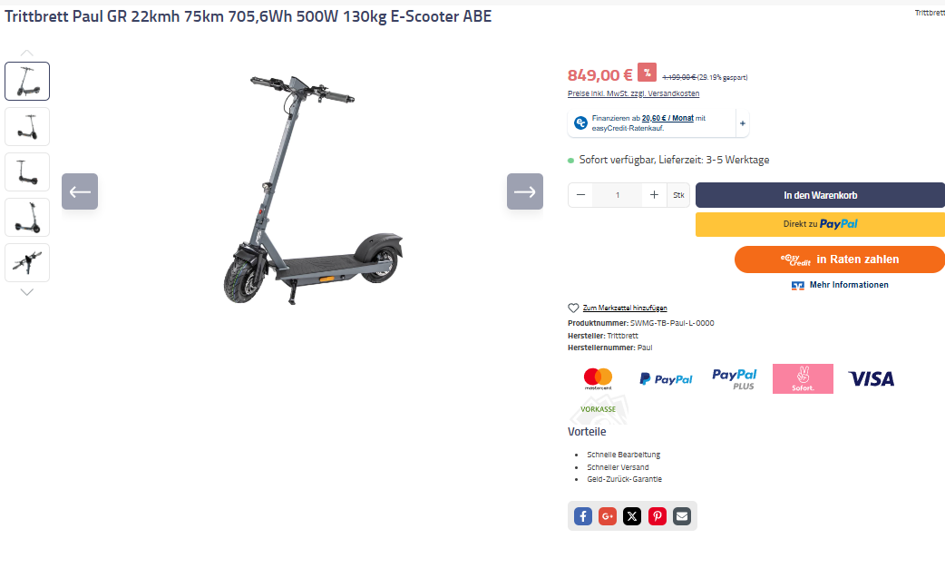 Der trittbrett paul ist ein starker, zuverlässiger E‑Scooter für Fahrer bis 130 kg. Mit 500W Motor, 22 km/h Geschwindigkeit und 75 km Reichweite kombiniert er Leistung, Komfort und Sicherheit für Alltag und Freizeit.